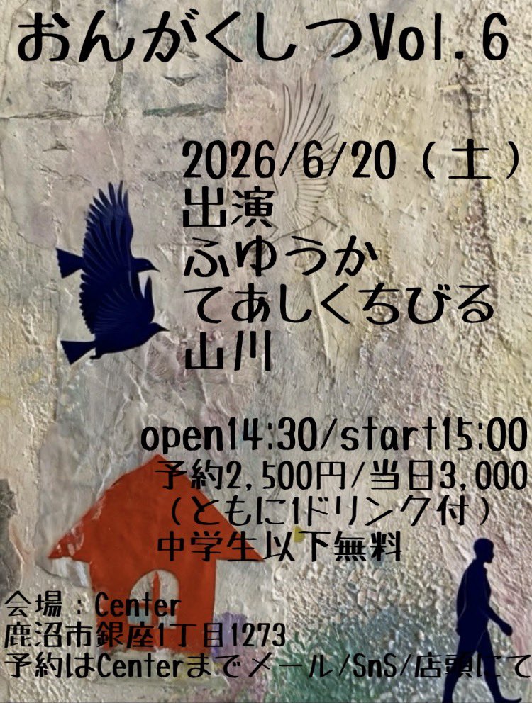 2026/6/20(土)おんがくしつVol.6 【出演】ふゆうかてあしくちびる山川 開場 14:30開演 15:00 予約2,500円 / 当日3,000円 (ともに1ドリンク付)中学生以下無料 会場:Center鹿沼市 […]