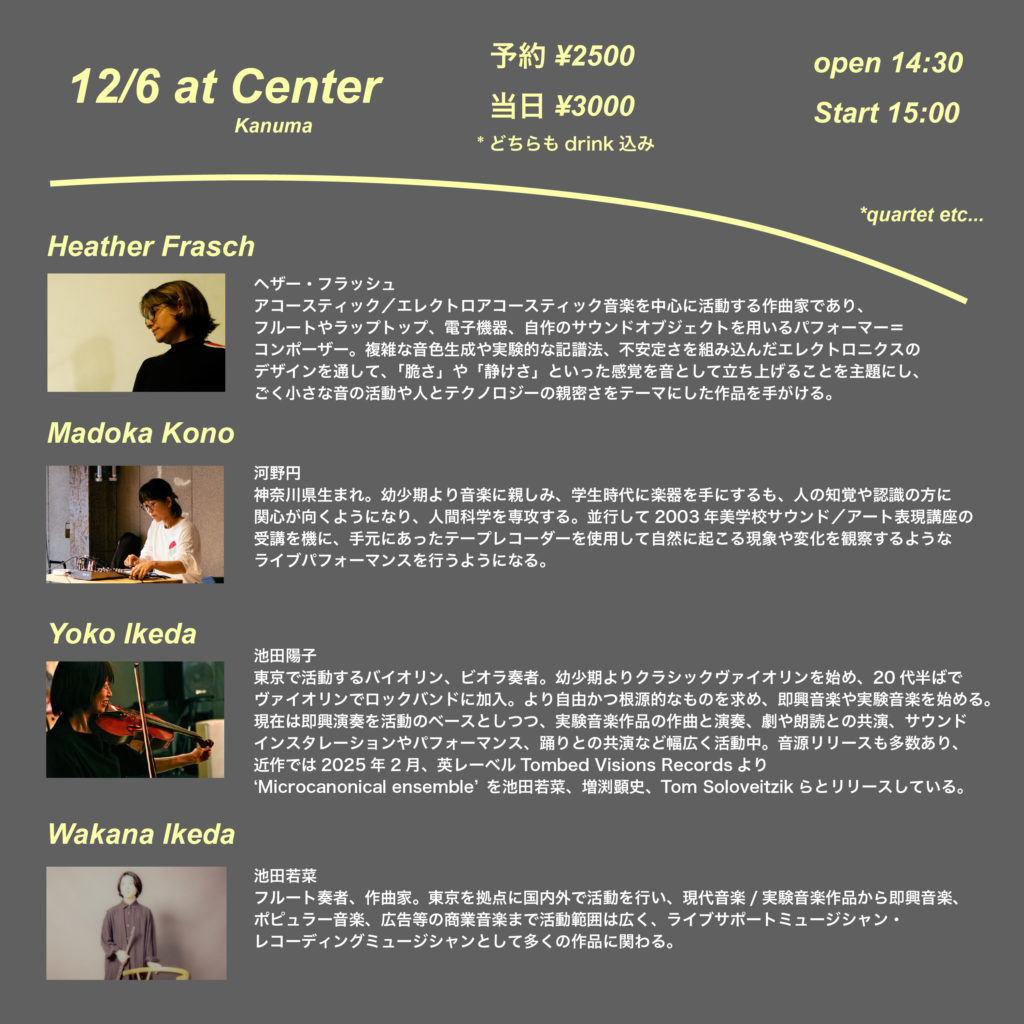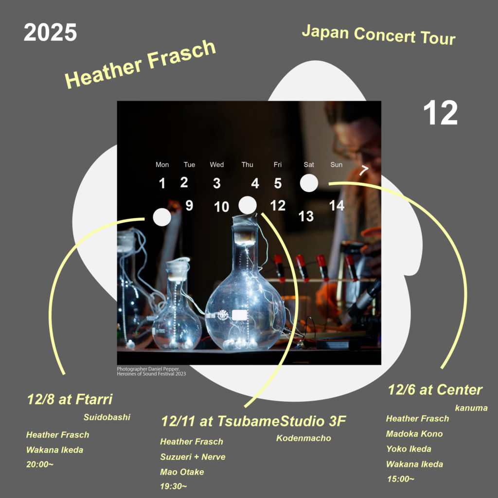 Berlin-based sound artist Heather Frasch makes her first visit to Japan! Also a composer and flutist, her delicate performances using laptops, electronics, and self-made sound objects are not to be missed!!