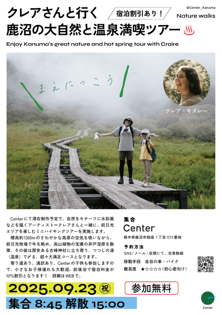 We will be holding a mini hiking tour to enjoy the Mae-Nikko area with Claire, an artist who will be staying here from September. While breathing in the refreshing air of the highlands, we will explore the Marsh(wetland), a treasure trove of alpine plants, then visit the historic Shrine, and finally enjoy the hot springs. Children from the Center will also be participating, so families with small children are welcome.