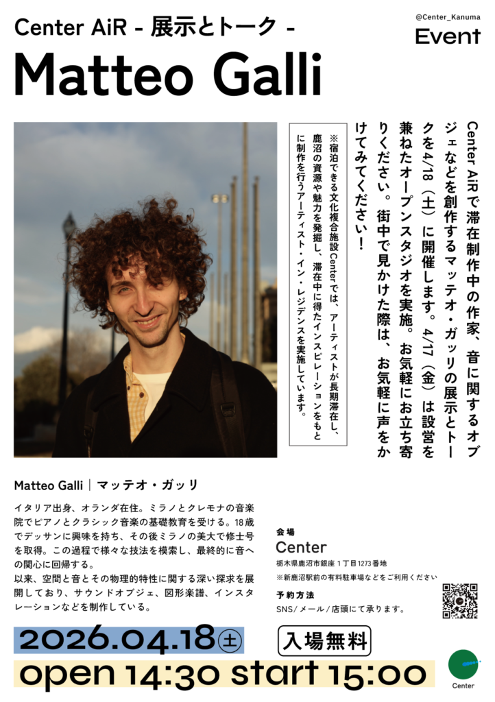 Center AiRで滞在制作中の作家で、音に関するオブジェなどを創作するマッテオ・ガッリの展示とトークを4/18(土)に開催します。