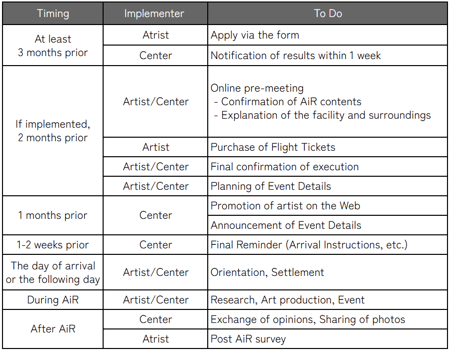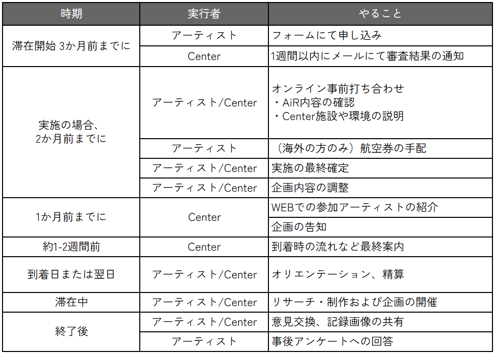 ・During the stay, please hold an event once such as an exhibition/ screening/ performance/ workshop/ talk.